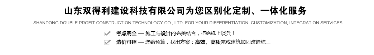 山東雙得利建設科技有限公司是一家集科研、工程技術開發、咨詢、工程結構加固改造檢測、設計、施工于一體的綜合性、專業化企業。公司注冊資金5001萬元,具備建筑工程施工總承包貳級、主體結構工程檢測、特種工程結構補強專業承包不分等級、地基基礎工程專業承包貳級、防水防腐保溫工程專業承包貳級、施工勞務不分等級資質?,F有高素質人才126人,其中高級工程師6人,一級注冊結構工程師2人,一級注冊建造師3人,一級注冊造價師2人,注冊監理工程師2人,二級注冊結構工程師4人,二級注冊建造師10人,中級工程師30余人,其他專業技術人員30余人。公司所有工程技術人員均從事工程施工行業多年。
